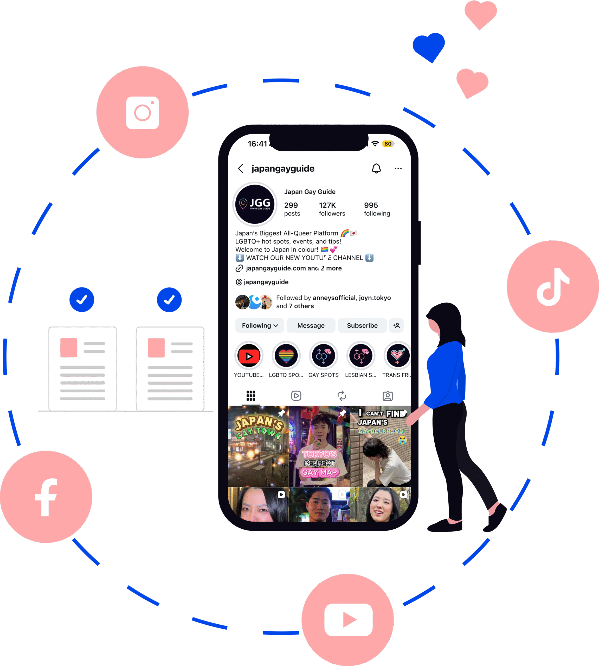 総フォロワー20万人超のJapan Gay Guideで、単発のSNSプロモーション、メディア掲載、両方まとめてのセットをご用意。短期の到達と中期の自然流入を同時に狙います。